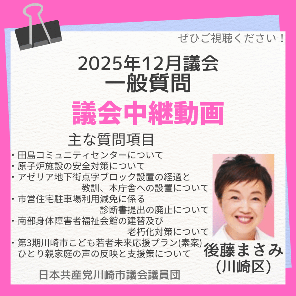 2025年12月18日の川崎市議会定例会で、後藤真左美議員が一般質問を行いました。主な内容は以下の通りです。